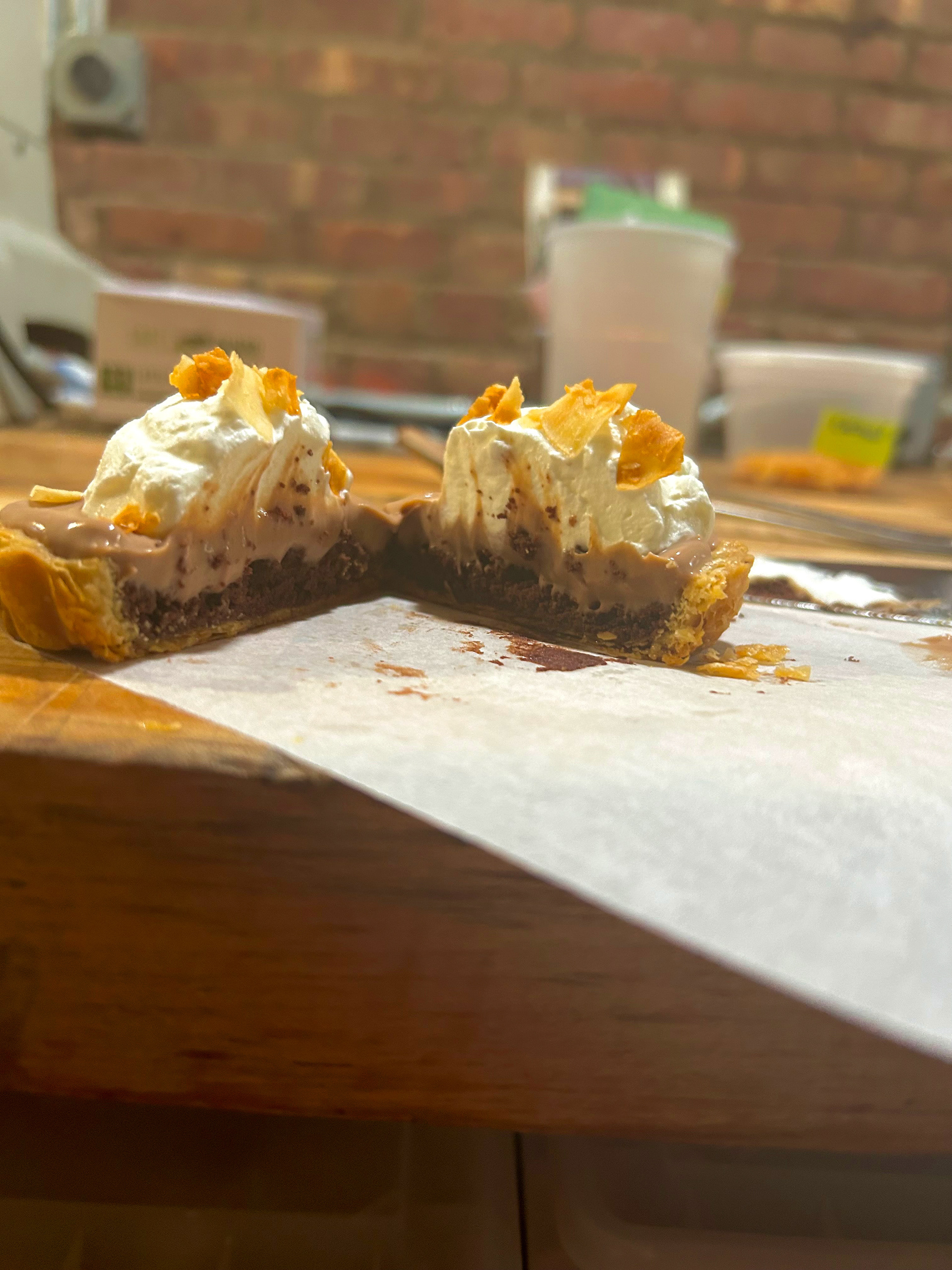 A puff pastry shell with a fudgy chocolate base, chocolate custard, and coconut whipped cream. Sprinkled with a generous (but tasteful!) amount of toasted coconut flakes.