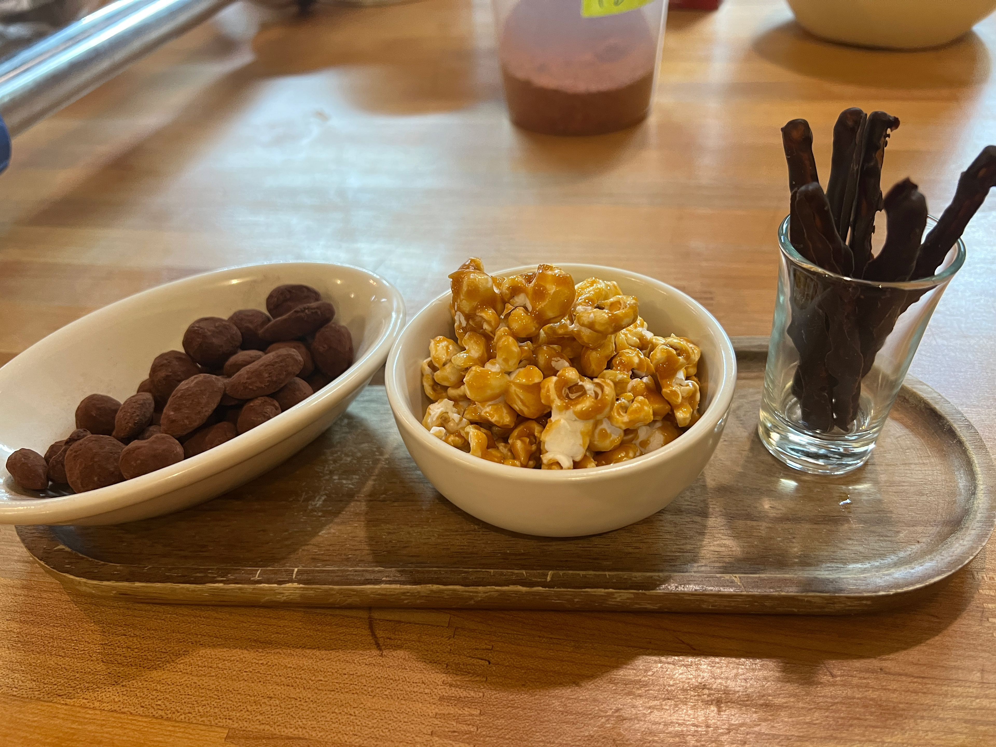 The best trio for bar snacking: chocolate covered nuts, caramel corn, and chocolate covered pretzels:)